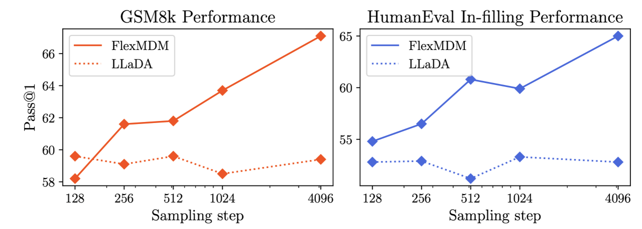 We retrofit an 8B parameter LLaDA model into FlexMDM using 1000 H100 GPU hours. By allowing the model to insert new tokens in arbitrary positions, FlexMDM exhibits better reasoning capabilities on real-world reasoning tasks such as coding and grade school mathematics.